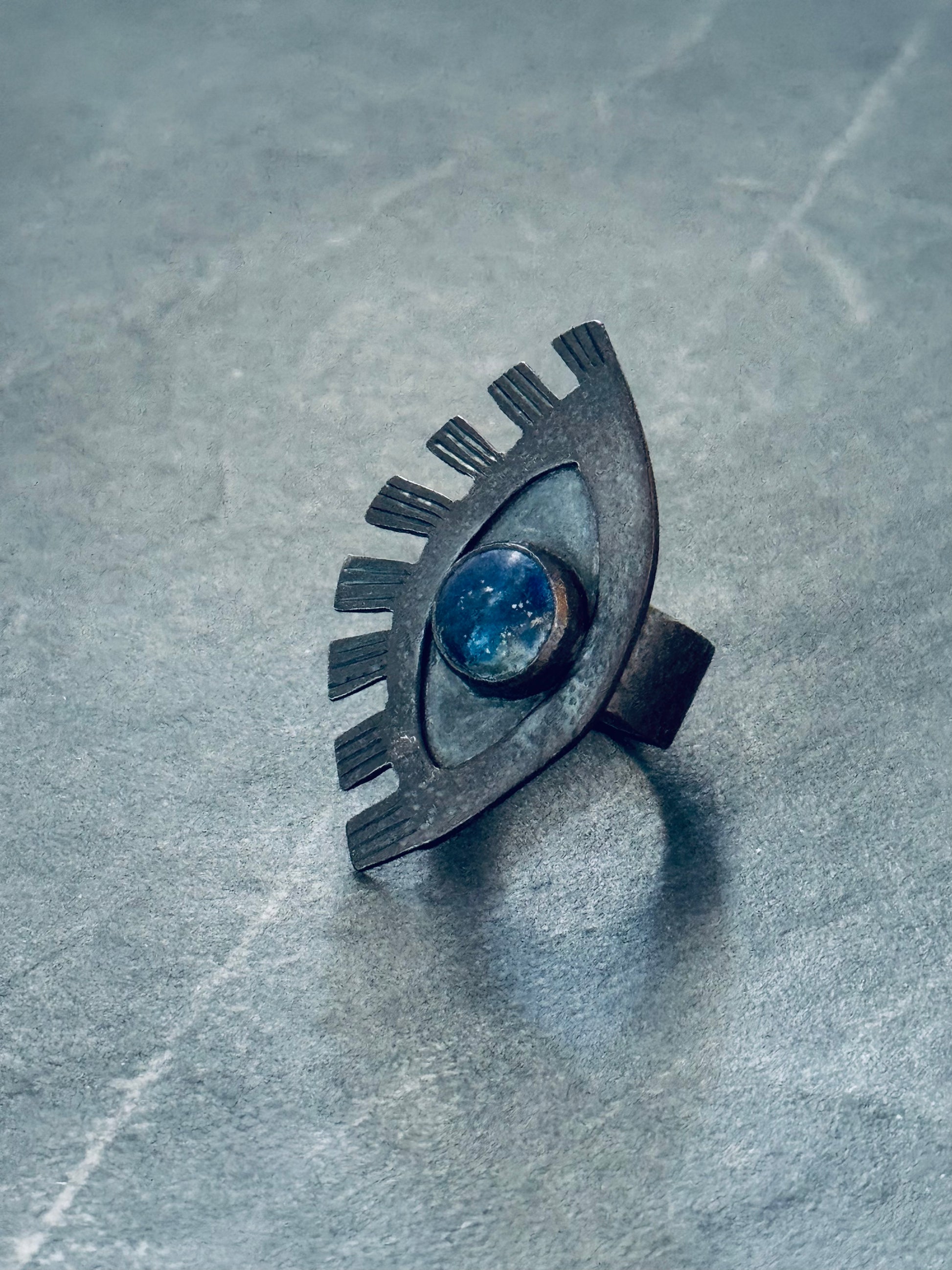 Forged in darkened sterling silver, spiked with lashes, and set with lapis lazuli—this ring doesn’t whisper. It sees.